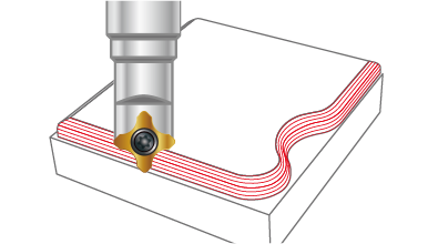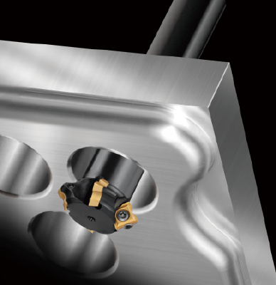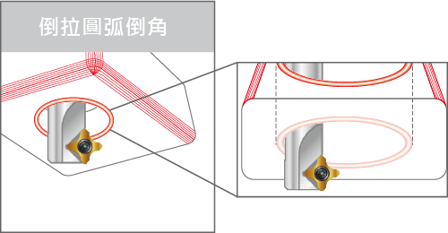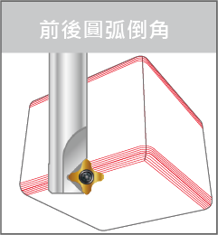 捨棄式倒角銑刀。不同圓弧倒角銑刀刀片,可直接裝置在車銑萬用鑽標準刀桿上。