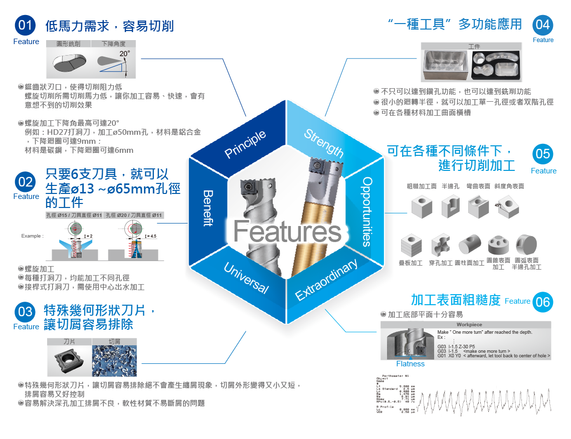 每一支刀具都能依NC電腦指令,生產不同孔徑,不同深度的工件,大幅降低刀具庫存,減低刀具成本,