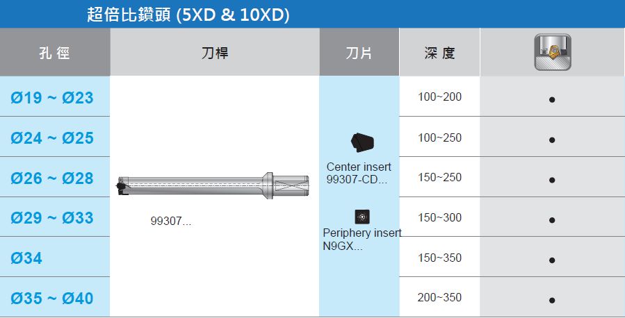 自我中心導引加工使切屑呈螺旋小碎屑。5-10XD: Ø19 ~ Ø40