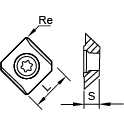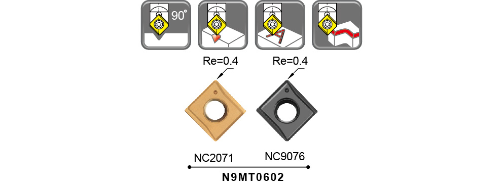 • NC9076 :• 適用非鐵金屬,鋁合金,鈦合金,銅合金,長切屑軟金屬 • 優異的加工表面• 刀片有2個切削刃口