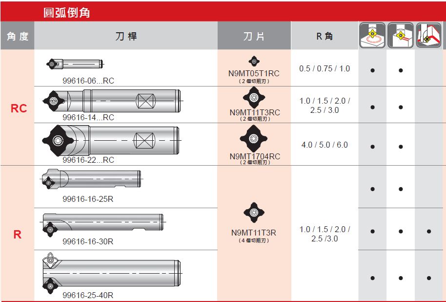 不同圓弧倒角銑刀刀片,可直接裝置在車銑萬用鑽標準刀桿上。鎢鋼圓弧倒角刀片,加工壽命長 加工表面優異,圓弧曲線流暢