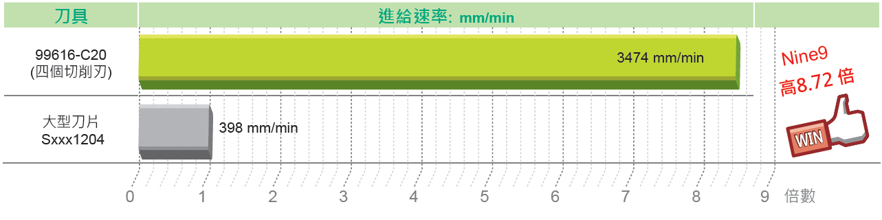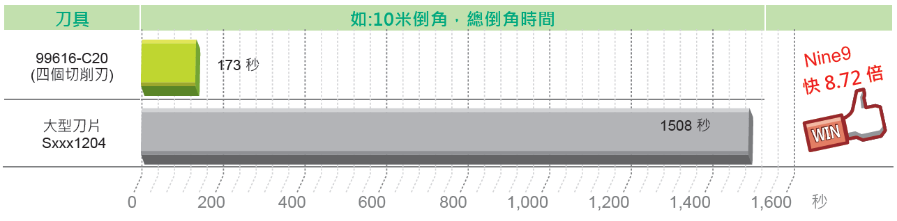 • 倒角刀具搭配大型刀片 (Sxxx1204) 與 Nine9 N9GX04 刀片。