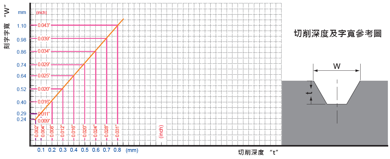 - 圖表使用,首先選擇需要字寬W(垂直軸),再選擇刻字的角度(45°或60°)參考線,取得參考點後